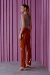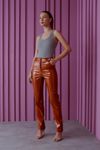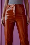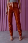 Calça cintura alta, shape levemente reto. Tecido recoberto com poliuretano. Possui caimento estruturado, com cobertura brilhosa e efeito vinil, conferindo um visual moderno e tecnológico à peça. Atenção: observar modo de uso.