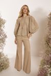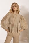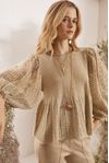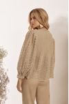 Blusa bata tricot godê. Toda rendada com trabalho diferenciado e acabamento lurex ouro. Mangas fartas bufantes que insere visual moderno e sofisticação à peça.