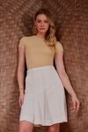Bermuda tipo saia cintura média. Blusa corset decote armação. Detalhe lapelas e pespontos contrastantes que valorizam. Zíper posterior de metal destacável. Feito em sarja eco de algodão e tencel. Fibra lenzing tencel é feita com 50% menos emissão de carb