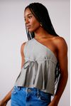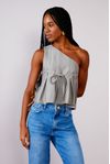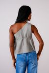 Blusa cropped um ombro. Tiras para amarrar e pregas. Confeccionada em alfaiataria mescla.