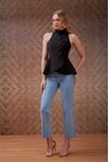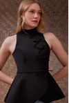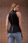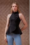 Blusa crepe toda estruturada. Basque, recortes e lacinhos que inserem visual moderno e feminino ao look.