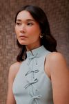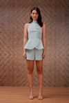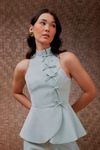 Blusa crepe toda estruturada. Basque, recortes e lacinhos que inserem visual moderno e feminino ao look.
