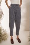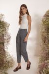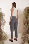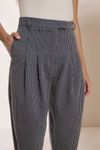 Calça cintura alta modelagem baggy com pregas. Tecido tipo jeans tramado de risca de giz. Ecológico feito a partir de tecidos e peças confeccionadas descartadas. Esse processo reaproveita a fibra e otimiza todo ciclo da cadeia produtiva do algodão.