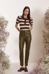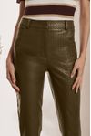 Calça skinny cintura média fendinha bainha. Couro fake de viscose com cobertura de poliuretano. Textura tressê que confere modernidade ao artigo.