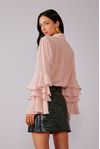 Camisa em crepe georgette fluido. Manga sino com babados. Os tecidos fluidos e com transparência deixam o look mais sofisticado.