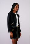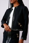 Casaco crepe com elastano e molduras vinil croco. Detalhe metal lateral que valoriza à peça.