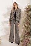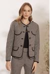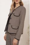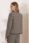 Casaco estruturado lapelas e vivo em alfaiataria black. Botões forrados com rebite floral. Tecido algodão mesclado aspecto flanelado, fios tintos em desenho xadrez nano.