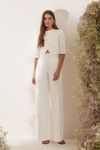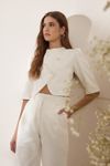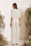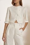 Conjunto calça wide leg, cintura alta e pregas. Casaquete cropped com transpasse diagonal e botões forrados. Feito em algodão caimento estruturado e visual rústico, que utiliza menos água e emite menos CO².