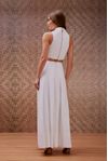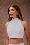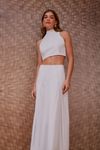 Conjunto em tricoline com toque "paper". Saia cintura alta e pregas. Blusa cropped, recortes e gola