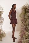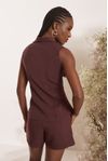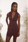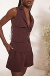 Conjunto colete lapelas. Botão floral artesanal pintado à mão com miolo de strass. Short cintura alta e pregas. Crepe alfaiataria estruturada e visual mais rústico