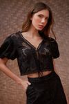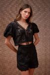 Blusa cropped com rolotê para amarração e mangas balonês. Aplicação de bico aviamento. Short cintura alta pregas. Conjunto confeccionado em laise de guipure com trabalho floral.
