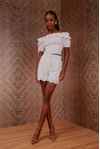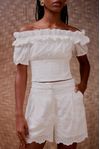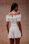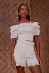 Conjunto blusa ombro a ombro babadinhos, cintura ajustada. Short cintura alta com acabamento em bico. Feito em laise bordada 3D.