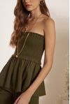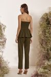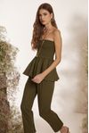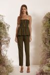 Conjunto em linho misto, rústico, feito a partir de fibras desfibradas. Blusa lastex com basque. Calça alfaiataria cintura alta e perna reta.