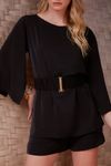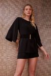 Conjunto crepe fluido. Blusa tipo túnica fenda mangas. Cinto elástico rebatido com fivela de encaixe banho dourado. Conjunto super versátil e chique.