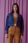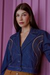 Jaqueta shape over super moderna. Jeans intense blue com toque tipo resinado. Detalhe casa inglesa. Bordados sinuosos em linha grossa ocre contrastantes. Punhos largos todo pespontado. É uma peça super irreverente, com trabalho de bordado moderno e muito autêntico.