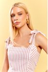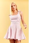 Macaquinho vestido sobreposição godê traz conforto e versatilidade. feito em tricoline listrada fio tinto tipo anarruga, detalhes vivos em off white que dão toque especial à peça.