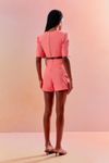Macaquinho curto com abertura na lateral da cintura e costas que traz um charme extra, mangas românticas, detalhe de lapela com botão forrado e short saia na frente. Uma peça charmosa, que traz jovialidade e um toque de sensualidade.