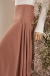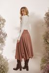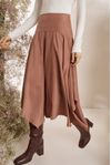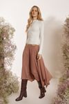 Saia midi pala ajustada. Pontas assimétricas que insere modernidade ao look. Tecido tipo cupro de viscose e poliéster com toque peletizado e caimento impecável.