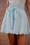Short tricoline listrada. Cós de elástico rebatido, acabamento micro preguinhas. Shape godê, soltinho e finalização bordado festonê.
