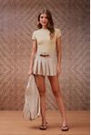 Short saia cintura média. Tecido efeito melange, fios mesclados tipo anarruga. Saia pregas, aviamento fivela em couro com botões de pressão, destaca para lavar. É uma peça super estilosa com informação de moda.