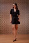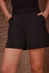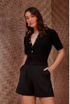 Short crepe cintura alta. Cós de elástico rebatido, alhetas geométricas com botão forrado.