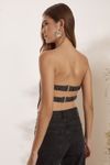 Top corset tira elástico costas e fivela de encaixe banho prata. Malha com textura em pespontos e brilho lurex prata.