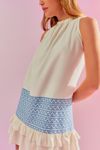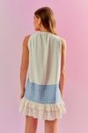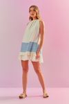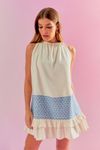 Vestido curto bata. Cava americana, camadas de babados. Tecido de fibras leves certificadas. Bordado étnico barrado localizado. Peça super fresh para o verão.