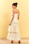 Vestido midi em bordado cordone voil 100% algodão. Camada dupla de babado, acabamento sianinha e pequeno vazado lateral. Os bordados são destaques para um alto verão chique.