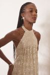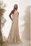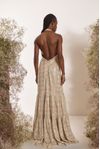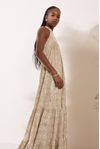 Vestido longo godê recortes franzidos. Crepe de musseline com bordado alinhavado de linha, micro paetês brilhantes e paetês foscos.