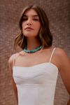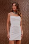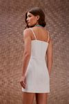 Vestido curto algodão caimento estruturado e visual rústico, que utiliza menos água e emite menos CO². Recortes diferenciados e shape tubinho.
