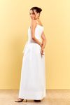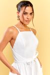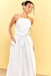 Vestido midi com modelagem super moderna. Fechamento tipo avental, interno 2 botões de pressão e por fora tira para amarrar. Bolsos laterais. Tricoline com toque paper.