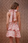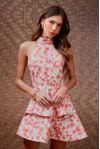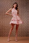 Vestido curto babado godê. Barra com aplicação de crinol interno que insere volume sofisticado. Gola drapeada, frente única . Base sarja de algodão eco sustentável, feito de algodão BCI, que controla a quantidade de agrotóxico usado e utiliza menos água
