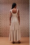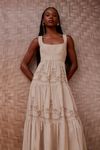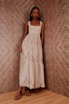 Vestido midi godê franzidos. Bordados em richelieu arabescos em tom caramelo. Tecido efeito melange, fios mesclados, tipo anarruga.