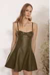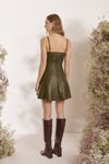 Vestido curto godê, recortes e bojo estruturado. Couro fake de viscose com cobertura de poliuretano. Textura tressê que confere modernidade ao artigo.