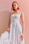 Vestido midi de algodão com viscose e listras metalizadas com detalhe de entremeio de renda, decote tipo corset, saia godê e pontas tipo lenço.
