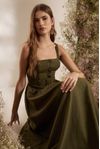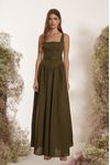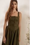 Vestido longo godê recorte em v com franzidos. Cinto forrado e decote quadrado. Linho misto, rústico, feito a partir de fibras desfibradas.
