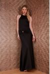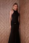 Vestido longo shape sereia. Pala drapeada com passante formato globo em banho dourado. Malha eco com leve acetinado feita a partir de fibras de madeira de reflorestamento.