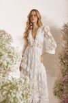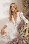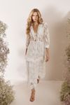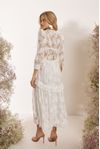 Vestido midi godê babados. Decote v, acompanha top underwear. Renda la Bohème fluida de poliamida e algodão, desenho floral delicado.