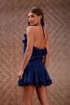 Vestido curto em georgette fluido. Frente única, pala drapeada. Babados que se destacam através da aplicação de fios de nylon. Modelagem super feminina e icônica.