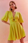 Vestido linho com viscose curto, saia gode e bainha larga aplicada. Pala na cintura com pregas e laço borboleta removível, manga bufante e balone dão todo o toque de charme e feminilidade.