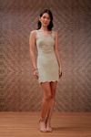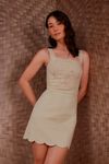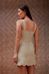 Vestido curto algodão com elastano com toque levemente paper. Bordados richelieu, acabamentos em festonês. Modelagem tradicional, mas com detalhes que valorizam.