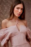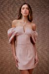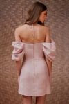 Vestido curto cintura ajustada corset. Bojo pregas pespontadas, ombro a ombro. Decote com armação e rolotê para amarrar. Tecido crepe com aspecto levemente irregular.