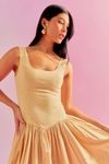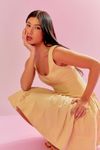 Vestido tricoline com toque "paper". Decote quadrado, cintura ajustada. Saia godê com recorte em v e franzidos que valorizam. Peça super jovem e moderna para estação.