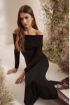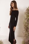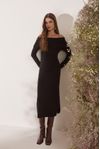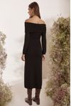 Vestido tricot ombro a ombro com dobra canelada. Comprimento midi e fenda lateral.