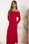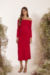 Vestido tricot ombro a ombro com dobra canelada. Comprimento midi e fenda lateral.