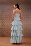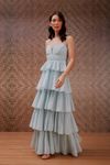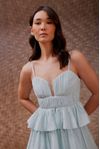 Vestido long midi camadas de babados franzidos. Tecido voil de algodão, bojo e pala cintura drapeados. Decote com armação. É uma peça chique, em cor pastel, perfeita para ocasiões especiais, Invista!