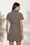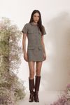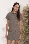 Vestido modelagem tubinho, pences, lapelas e botões forrados. Tecido algodão mesclado aspecto flanelado, fios tintos em desenho xadrez nano.